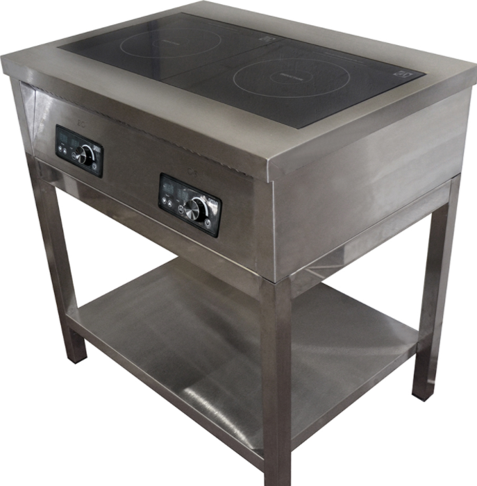 Базовые индукционные напольные плиты изготавливаются со сплошной полкой. Каркас полностью из нержавеющей стали: полка и столешница AISI 430 толщиной 0,8 мм, ножки труба AISI 430 40x40x1,5 комплектуются регулируемой пластиковой опорой.