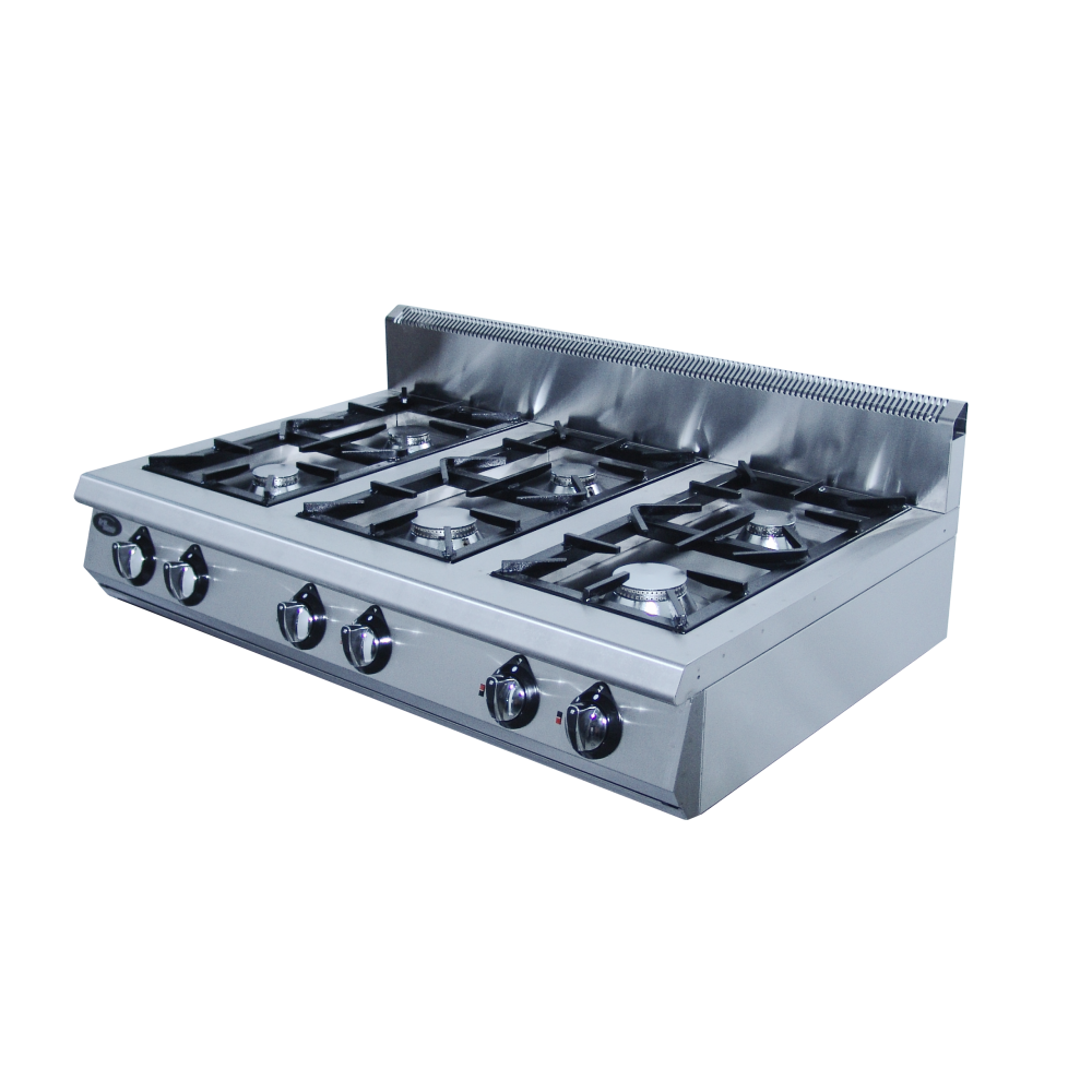 6 профессиональных горелок класса Heavy Duty, 4 горелки по 6.5 кВт, 2 - 9 кВт, газовая мощность 44 kW, газ/контроль, г.нетто 1180x800x320, 136кг, брутто: 1330х950х620, 161 кг.