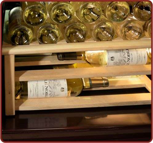 Высокоточная электронная система управления с цифровым дисплеем позволит настроить требуемую температуру в каждой зоне охлаждения и дозревания белого и красного вина. Использование деревянных полок из ценных пород дерева придает благородный аромат и внешний вид холодильной камере.
